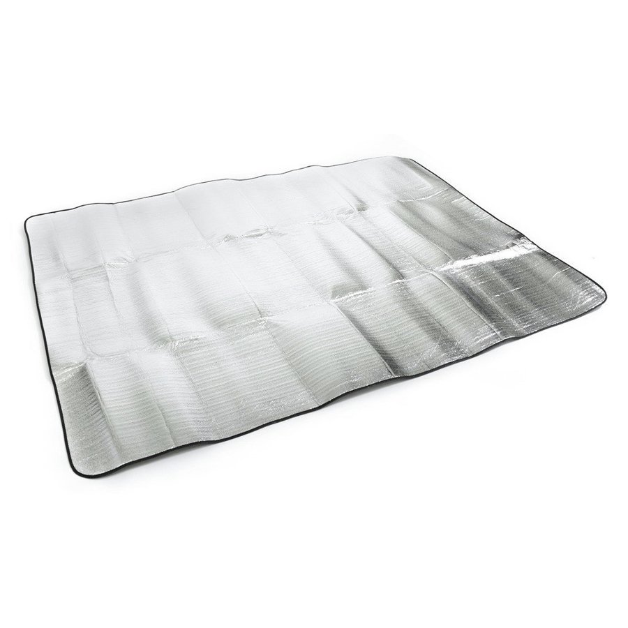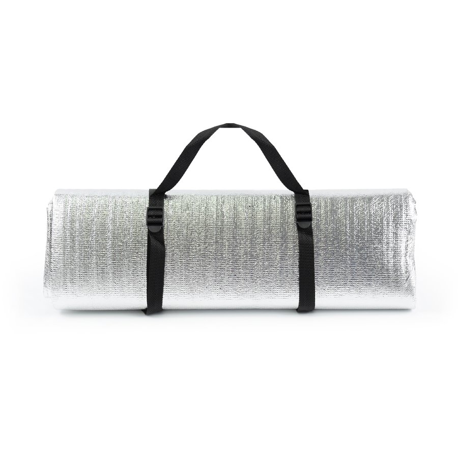 Dolna i górna warstwa maty wykonana z foli aluminiowej, która zapewnia bardzo dobrą izolację od podłożą i wodoodporność (możliwość zastosowania nawet na mokrej trawie). Środkowa warstwa maty wykonana z EPE, który zapewnia amortyzację, elastyczność i izolację termiczną. Idealna do namiotu lub jako warstwa izolacyjna pod koc. Łatwa w przenoszeniu – wygodna rączka i zapięcie na troki.