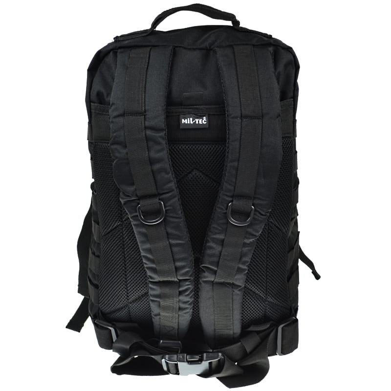 Lekki plecak taktyczny firmy Mil-Tec w kolorze czarnym o całkowitej pojemności 36 litrów. Plecak wyposażono w dwie duże komory główne. W pierwszej znaleźć można dużą przegrodę z siatki oraz zamykaną na zamek kieszeń na drobne przedmioty. W drugiej znajdują się dodatkowe przegródki na dokumenty, itp. Na przednim przedziale naszyte są dwie kolejne kieszenie, z których dolną wyposażono w więcej przegródek. Wszystkie kieszenie zapinane są na mocne dwukierunkowe zamki z grubymi zębami.