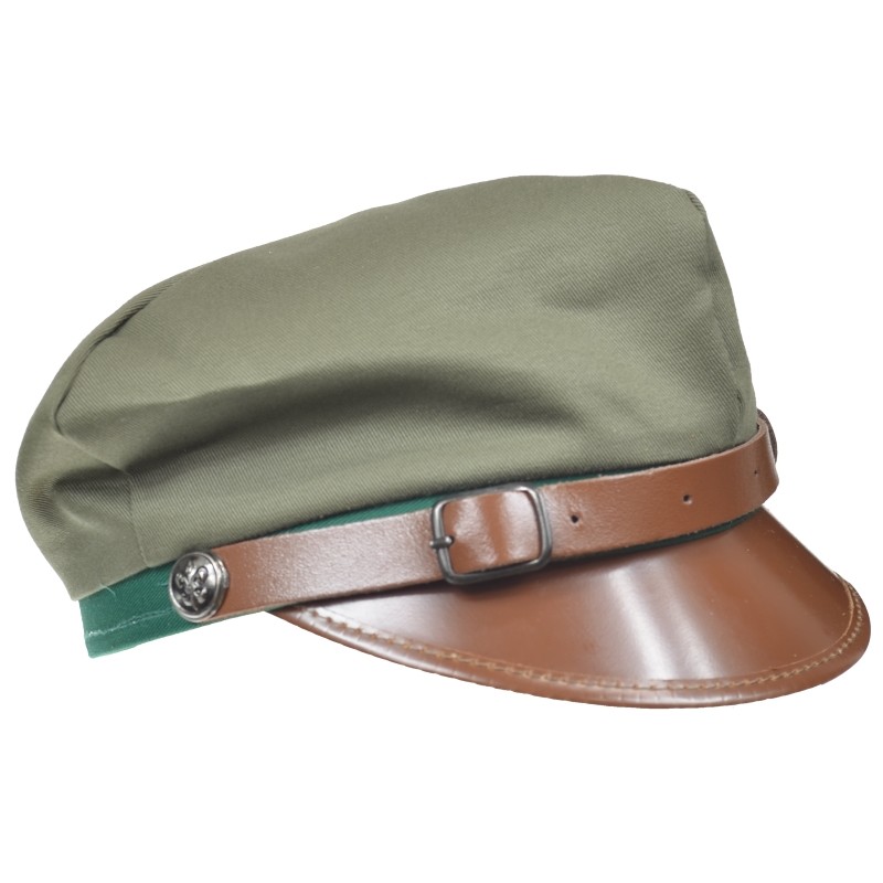 Pasek nad daszkiem wykonany jest z ciemnobrązowej skóry i ma flauszowe obszycie.